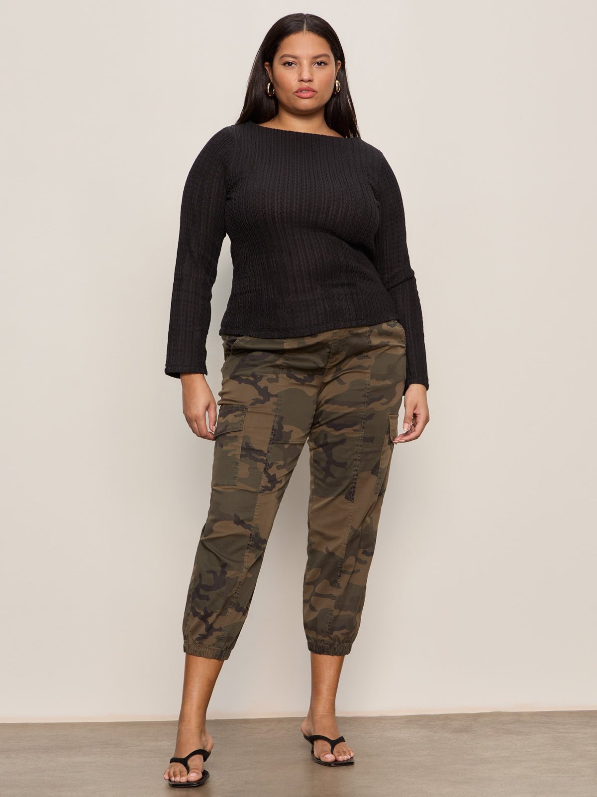 Long Sleeve Boatneck Textured Top Black Extended Sizing